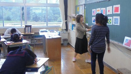 写真は、6年生が友達に行きたい国を英語でヒントを出し合って紹介している一場面です。「I want to go・・・」