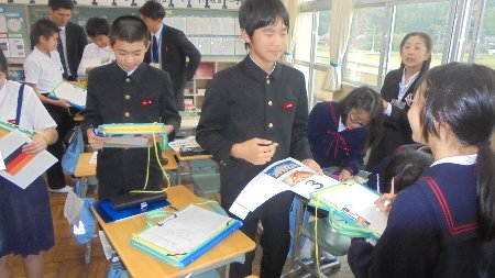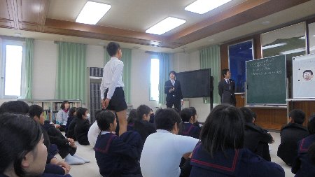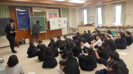 3.4限目は、会議室で金沢弁護士会より北村先生と東先生をお招きして、弁護士といった立場からいじめについて考えました。お二人ともお若く子どもたちは親近感を持って話を聞くことができました。特に東弁護士は大海小学校出身ということもあり、最初から大盛り上がりでした。