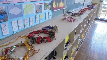 見てほしいな、1年生の朝顔リースと図工の工作。
