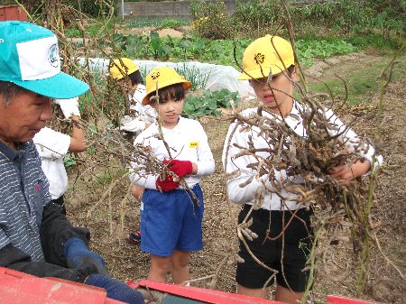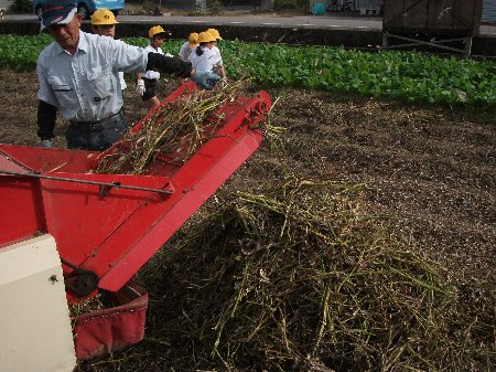お知らせが遅くなってしまいましたが、先週の金曜日に大豆を収穫しました。春から大事に育てた瀬戸町の畑で行いました。今回もお世話して下さっている髙﨑さんにお手伝いしていただきました。以前枝豆で食べた大豆とはずいぶん色や形が変わっていて、びっくりしました。機械を使って豆だけ収穫できるのも不思議でした。