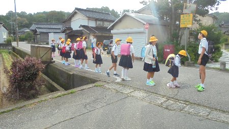 畑のすぐ横では、安全ボランティアの方に見守られて今日も元気に子どもたちが登校していきます。