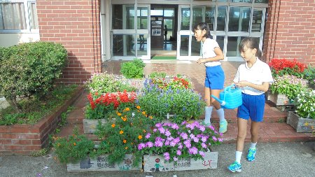 2016年9月26日 16時00分 前庭はまだ夏の花がきれいに咲いています。運動場側の花壇もボリュームいっぱい、このあと何を植えていくといいのでしょう。地域からのアドバイスお待ちしています。