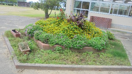 前庭はまだ夏の花がきれいに咲いています。運動場側の花壇もボリュームいっぱい、このあと何を植えていくといいのでしょう。地域からのアドバイスお待ちしています。