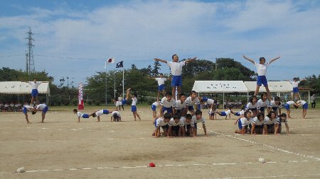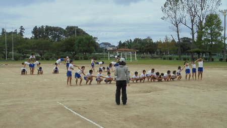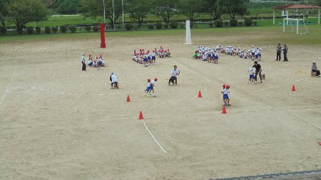 午後からはできたての入場門を早速使って団体種目の練習をしました。二人一組になって背中合わせに腕を組みリレーする種目です。見ている方が面白いです。