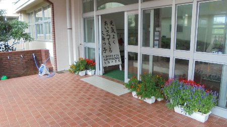 台風に備えて玄関に飾ってあったプランターの花を一晩避難しました。さいわい強い風もそれほど吹かず被害もありませんでした。今日そのプランターを元の場所に戻すため、6年生のMくんが手伝ってくれました。重いプランターを一つずつ元のプランターボックスにもどす作業は大変です。よろこんで奉仕作業をしてくれるMくんはとってもえらいです。そばにいた下級生も散らばった花びらをきれいにはいてくれました。おかげで元通り花いっぱいのきれいな玄関に戻りました。ありがとう。