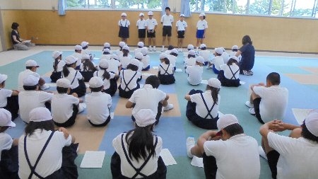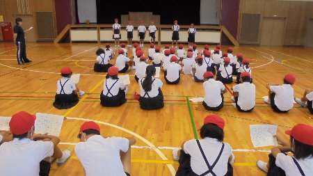 紅白に分かれて応援練習が始まりました。第1回目は白組がプレイルーム、赤組が体育館で結団しました。さっそく応援歌の披露と練習です。今年はどんな曲の替え歌でしょうか。私は、赤組の○○しかわかりませんでした。子どもたちはすらすらでした。