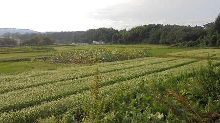 ソバの花だそうです。少し開花が遅いようですが朝露の中真っ白な花が見頃です。来年は学校でソバ作りに挑戦しようかな。誰かよい先生がいましたらご紹介ください。