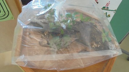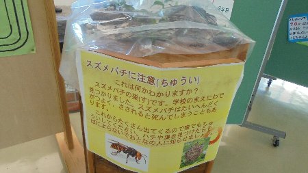 先日お知らせした「スズメバチ」の巣を玄関に展示しています。さわってもだいじょうぶなように厚めのビニール袋に入れてあります。今日見てみると幼虫がさなぎ、さなぎが成虫に変わってきているような気がします・・・これも勉強ですね。