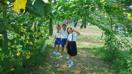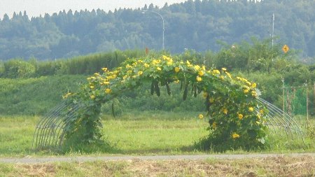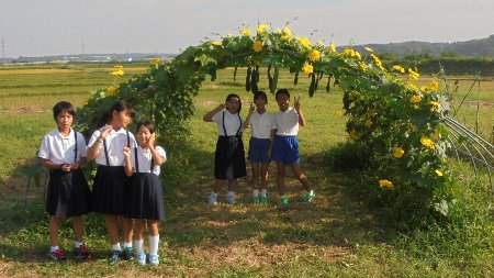 学級園のヘチマが花盛り、実もずいぶん大きくなりました。つるをはわす支柱にしっかり絡みつき花のトンネルになっています。そして台風にも負けずその中に実がいくつもぶら下がり、子どもたちが観察しています。お近くの方はトンネルを見に来てください。