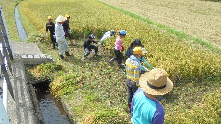 春に自力でたんぼ全面に手植えをした学校田の稲が今年も実をつけ、いよいよ刈り取りの日になりました。今日まで水の管理や除草、子どもたちに替わってお世話くださった木本さんや松田さんのおかげです。本当にありがとうございました。