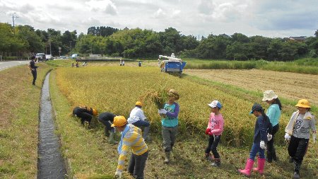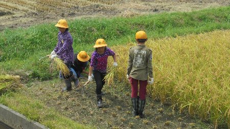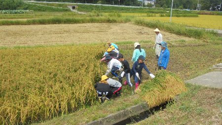 木本さんからかまの使い方、束ね方を教えてもらった後たんぼに入って行きました。今回はコンバインの力も借りてすべての稲を刈り取りました。さっそくライスセンターでもみすりされ、360kgの収穫がありました。おにぎりづくり、もちつきに使う予定です。