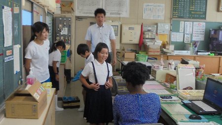 2016年8月25日 15時43分 先日2学期から本校の英語教育をアシストしてくださる先生が赴任したことをお知らせしました。名前はシァンさんです。今日は、大海小学校での勤務日でした。登校日だった3・4年生とはやくも交流していました。上手に挨拶や自己紹介ができたかな。中学校の授業体験では6年生が実際に授業を受けました。2学期からもたくさんのことを習っていきます。
