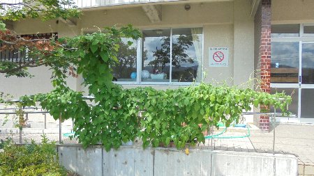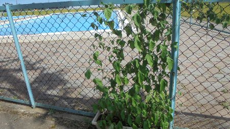 体育館前のアサガオの紹介です。たったプランター2個からこんなにアサガオのツルが伸びました。手すりや楓の木にもたくさん巻き付いてお化け状態。不思議なことにまだ花が咲きません。咲き始めたらすごいことになるでしょうね。そのときの写真をお楽しみに。プールのフェンスにも注目。