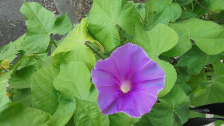 2016年8月15日 16時10分待ちに待ったアサガオの開花です。ずいぶん待たされました。朝からの雨が刺激になったのでしょうか。プールのアサガオも同時に。