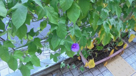 待ちに待ったアサガオの開花です。ずいぶん待たされました。朝からの雨が刺激になったのでしょうか。プールのアサガオも同時に。