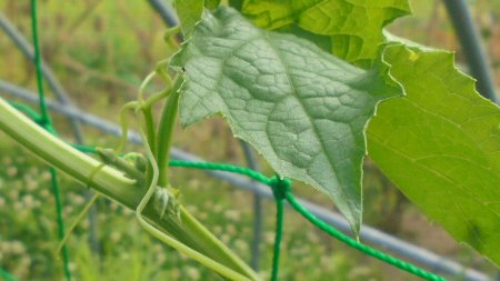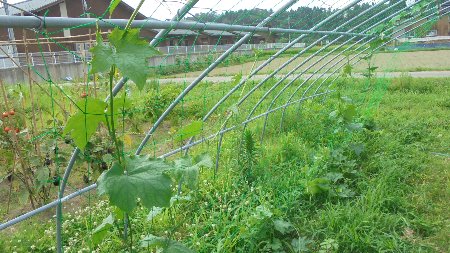 4年生のヘチマがつるをたくさん出して伸びています。支柱にネットをはってやったらからみついて上へぐんぐん伸びています。暑いのが好きで日によっては1日に20cmのびることもあるそうです。学校のヘチマも子どもたちの背丈を追い抜いているものもあります。
