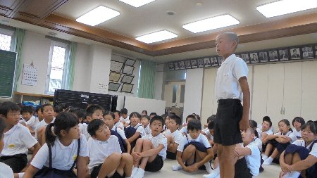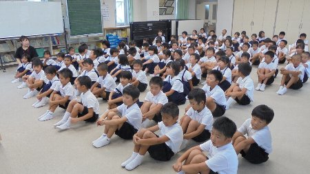 どのこの顔も日焼けして元気そうに見えました。校長先生から出された「暑さに負けずに元気に過ごす」という宿題をきちんとやっているようでした。たくさんの子が宿題をきちんとやっていると元気に手を挙げてくれました。