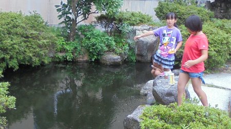 2016年7月25日 15時48分 今日は池のメダカにえさやりをしているところに合いました。春生まれたメダカがだいぶ大きくなっています。〔早生まれ)校内の理科室で生まれたメダカは、まだ1cmもありません。自然はすばらしいのですね。