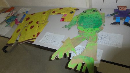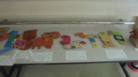 見て下さい。3年生は工作を教室前に展示してあります。割ピンを上手く使ってダンボールの部品をつなげただけでなく、自在に動かすことができます。