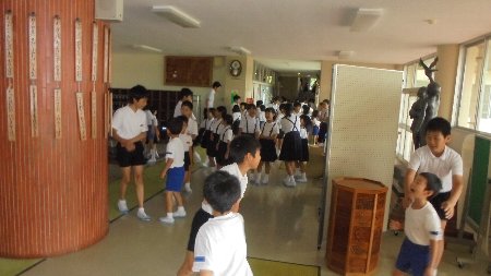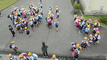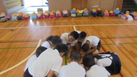 先週末は、体育館に全校の子どもたちが集まり、日頃の集団登校班で話し合いをしました。安全で仲よく登下校するために、みんなで話し合いました。