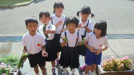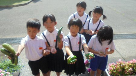 朝どれ、新鮮な野菜を2年生の子どもたちは収穫しています。今朝も豊作、手に手に野菜を持って玄関に入ってきました。一人の子が枝豆をくれました。でも、1個・・・どうやって食べようかな(笑)