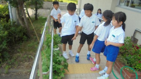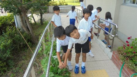 ここは体育館の前です。ここでプランターにアサガオが育てられていることに1年生が気づきました。大きな葉っぱ、ツルも伸びているのに花が咲いていないのを不思議そうに見入っていました。どうしてこんなに育ち方に差があるのか考えてみて下さいね。プールのフェンスの所にもアサガオのプランターが置かれています。花が咲いて見る人を楽しませてくれるといいですね。