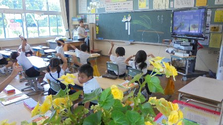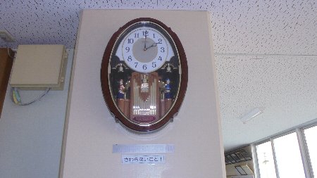 国語の勉強、いつも楽しく真剣に取り組んでいます。1年教室は、児童玄関に一番近く、9時、10時、11時・・・と定時になるときれいなメロディが聞こえてきます。玄関に卒業生が寄附して下さった掛け時計があります。毎時さわやかな音楽を流しています。下の人形も動いています。