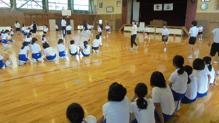 13日は、第2回全校一斉スポチャレの日でした。昼休み全学年が体育館に集まり、新記録に挑戦しました。梅雨の蒸し暑さがすごい日でしたが、どの学年どの子も頭から湯気を出して、全力で走っていました。