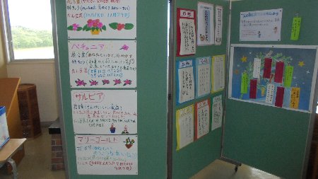もう一つはさわやか委員会が集会で玄関の花の名前を紹介したときに使ったカードを掲示しました。花言葉なんか書いてあって楽しいです。他にもまだまだ花が咲いています。実際に見ていただき、プランターにさしてある名札をご覧ください。