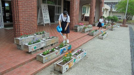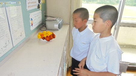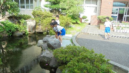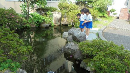 先週からメダカの世話を飼育委員会にしてもらうことにしました。えさやりをしていると低学年が集まってきて池に見入っています。池の中では、今年生まれた子メダカがすっかり大きくなっています。まだまだ卵をつけた親メダカもたくさん泳いでいます。写真のように前のめりになりすぎて池ぽちゃしなければいいのですが・・・