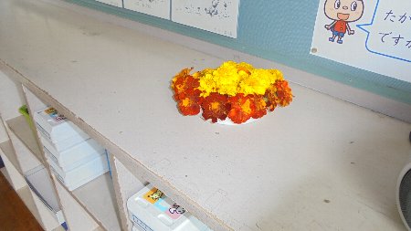 切った花・・・ほとんど茎が無い もったいないので皿に盛りつけ?教室に飾りました。長持ちすると良いのだけど。