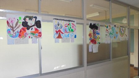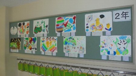 2年生の伸び伸びとした絵が掲示されています。いつでも来校ください。