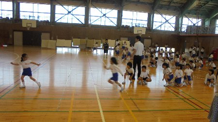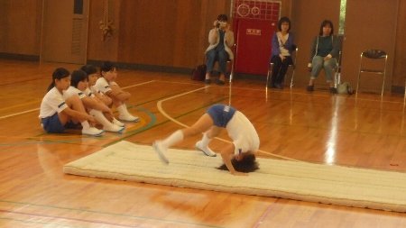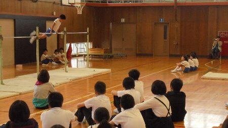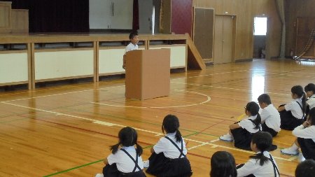 今月の歌や生活目標のふり返りに加えて今日は特別メニューが2つありました。一つは来週の月曜日の県下学童話し方ー会に出場する2年生の鍛冶澤さんともう一つは今週の水曜日の器械運動交歓会に出場する4年生の校内リハーサルです。