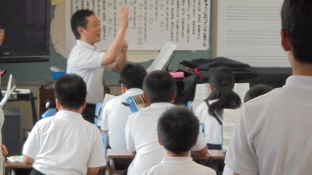 日に日に上手になっています。さらなる上達を目指して特別講師をお招きしました。高松中学校、ブラスバンド顧問の吉本先生です。先生はこれまで数々のコンクールで優勝を修めてきたすばらしい指導者です。みんなやや緊張気味でした。今日一日ですごくうまくなったこと間違いなしです。