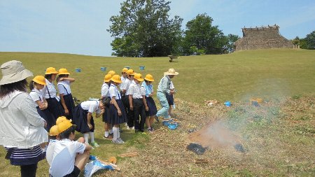 2週間前に粘土をこねて作った土器が乾燥したので焼きました。焼き方も本格的に野焼きで行いました。しかも雰囲気たっぷり、「大海西山弥生の里」遺跡で。写真に復元された竪穴式住居が写っていますね。