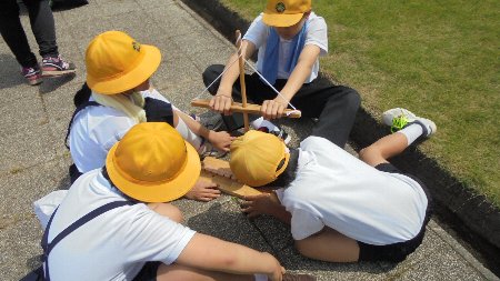 私たちの祖先も遠い昔ここで土器を焼いたのでしょうか・・・そんなことに思いを馳せながらがら。教育委員会油井さんと東さんにお世話していただきました。火起こしも体験し、見事すべてのグループが成功しました。授業参観の時飾ります。見てください。