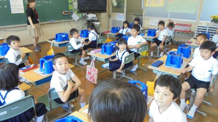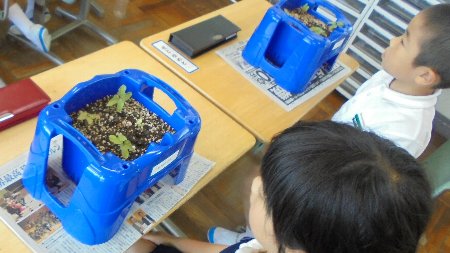 1年生が種まきした朝顔がかわいい芽を出しました。今日まで毎日水やりしたかいがありました。おもしろい葉の形を思い思いに表現している姿がすばらしかったです。発言している人の方をしっかり向いて話を聞く姿はとても1年生とは思えないくらいです。