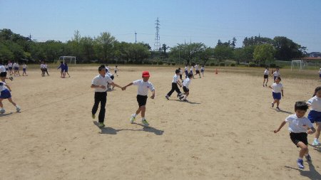 体育委員会が昼休み全校に呼びかけて、昼休み「鬼ごっこ」をしました。火曜日は、全校赤グループが昨日は全校白組が集まり、1年生から6年生まで仲良く外遊びをしました。どちらの日も天気が゜良くて最高でした。