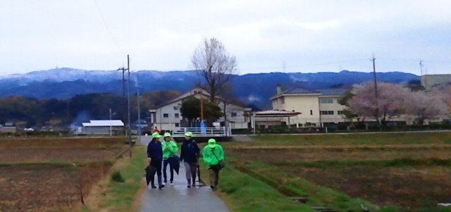 見守り隊の方が帰っていく写真をご覧ください。4月だというのに、なんと宝達山の上が雪で白くなっています。右側には校庭の桜が咲いている不思議な写真です。