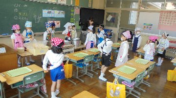 今日から1年生も給食を食べて下校することになりました。他の学校では1年生の内は、6年生が給食の準備や片付けを手伝ってくれます。本校では、この春まで保育園で上級生として自立していたことを生かし、自分でできることは少々時間がかかっても挑戦させています。