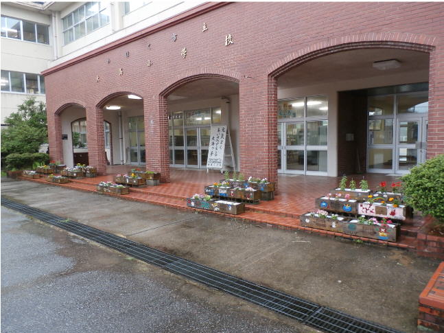 昨日からさわやか委員会の子どもたちとお手伝いをしてくれる子ともたちで夏の花を植えました。プランターに土を入れ、その中に3つ花を入れました。その後、肥料をやり、さらに水を与えてプランター入れに置きました。子どもの力ではプランターに土を入れるだけでも大変な作業なのですが、みんなで協力して玄関に飾ることができました。花の種類は、サルビア、ファリナセア、メランポジウム、トレニア、マリーゴールド、ベコニア、インパチェンス等です。これから暑くなると日増しに大きくなってくるでしょう。さわやか委員会がこれからお世話をします。きれいな花がいっぱい咲くことを期待します。