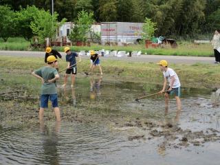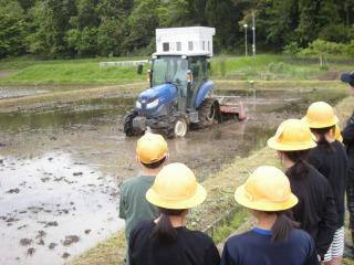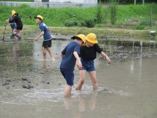 学校田で5年生が田植え前の代かきを行いました。毎年お世話になっている東さんに指導していただきました。初めて泥の中に入る子が多いようでしたが、泥の感触を楽しんでいました。協力しながら代かきの作業ができました。 連休明けの5/8(水)には田植えをします。