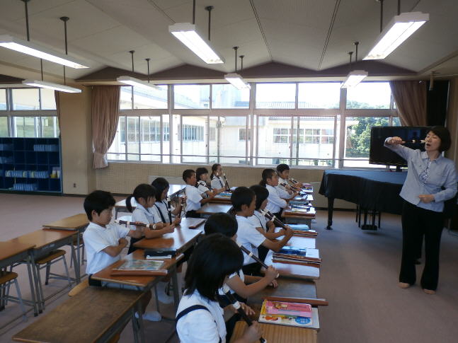 3年生から音楽の授業でリコーダを使います。今日は、プロのリコーダ演奏者を講師に招いて、タンギングや息の出し方を教えてくださいました。「ちょうちょう」「やまのおんがくか」などを児童と同じリコーダを使って演奏しました。素晴らしい音色に子どもたちはうっとりしながら聴いていました。一生懸命練習をして、ご家庭の皆さんにリコーダの音を聴かせる日が来ることを期待します。
