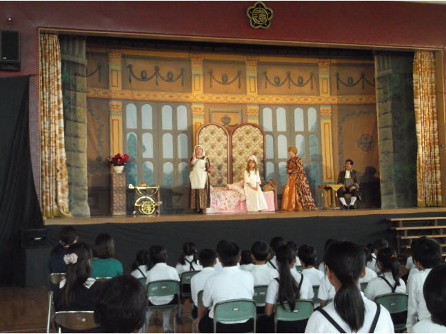 始業前に、体育館の中に入って行くと、劇団芸優座の劇団員が汗を流して舞台づくりをしていました。朝の6時から舞台設定をしていたそうです。