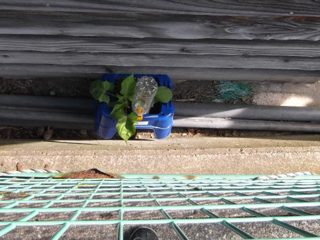 (歩道と倉庫の間に隠されてあった朝顔)