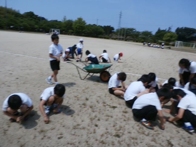 児童会主催で、長休みに運動場の草取りがありました。1年生から6年生までたくさんの児童が呼びかけに応えて来ました。1年生の児童の近くで草を取っていると、「僕たくさん取ったよ。」と誇らしげに話してくれました。運動場の草はあまりにもたくさんありますので、目に見えるほどの効果はでないかも知れませんが、豊かな心を育てる良い機会だと思っています。次回も児童会の企画に期待しています。