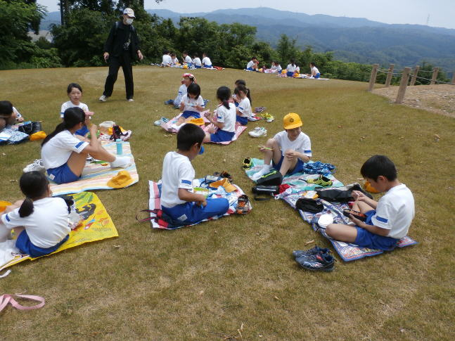 昨日、なかよし遠足をしました。10寺30分に最初のグループが出発しました。往きは、クイズラリーをしながら、グループで話し合って、考えを出しながら楽しく歩いて行きました。目的地に着くと、グループまとまってお弁当を食べ、その後1年生が参加できるような遊びをしました。鬼ごっこ、花いちもんめ、敷物を使って滑り台のようにして遊びました。5,6年生は下級生のお世話をして、自然にリーダーとしての力が出てきたように思います。大変暑いので、来年は時期を検討します。