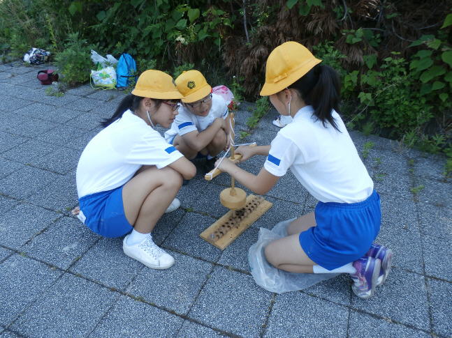 先日、かほく市教育委員会の生涯学習課の人に来て、歴史の出前講座がありました。社会で古代の生活様式を学び、土器についても学習しました。そこで、自分たちも土器を作って、昔の生活体験をすることにしました。今日は、先日作り乾かしてあった土器を西山弥生の里に行って、高い温度で熱して完成させます。野焼きの中に入れて、数時間燃やしたあとに出来上がります。野焼きをしている間、火起こし体験をしました。いくつかのグループは火起こしができましたが、思うように火はつかなかったようです。