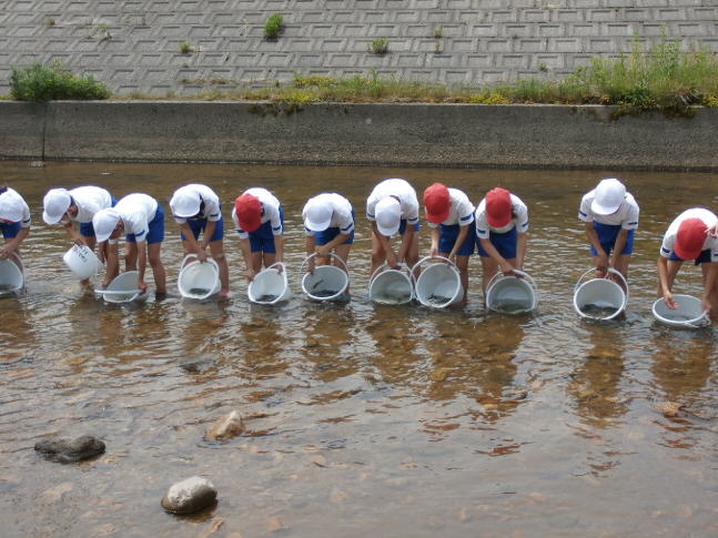 3年生は、総合的な学習の時間に「大海地区の自慢」を学習しています。児童は大海川に鮎が生息していることを誇りに思っています。今日は、大海川に行きました。
