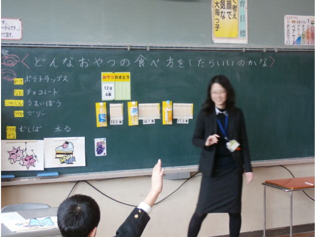 3限目に「食育(甘い物と健康)」について、2年生が学習しました。ゲストティーチャーは、かほく市の栄養教諭でした。授業では、日頃子ども達が食べるおやつにどれほど糖分が含まれているか、また、子ども達が一日に摂ってよい糖分量はどれくらいなのか学習しました。2年生が1日で摂取できる糖分量は、およそ20gだそうです。ジュースを1本飲むだけで摂取量を超えてしまうので、「これから食べるものがない」「飲むものもなーい」と不安になっていましたが、おやつの上手な食べ方や一度にジュースを飲まないことなどを理解しました。。子ども達にとって、甘い物を控えることはしっかりと脳裏に焼き付いたようです。歯と口の健康づくりや食育を通して、自分の体は自分で守れるよう、今後も健康教育に力を入れていきます。